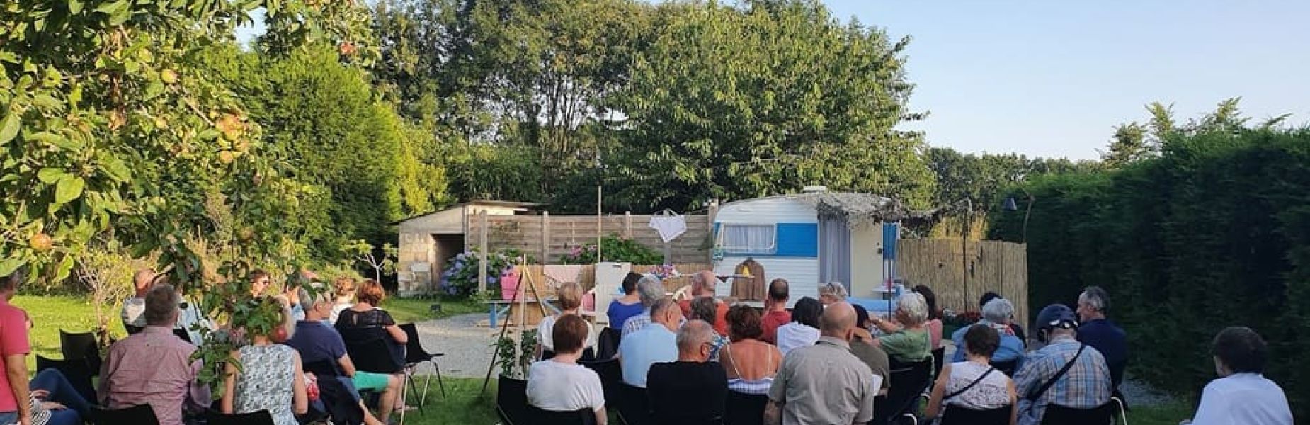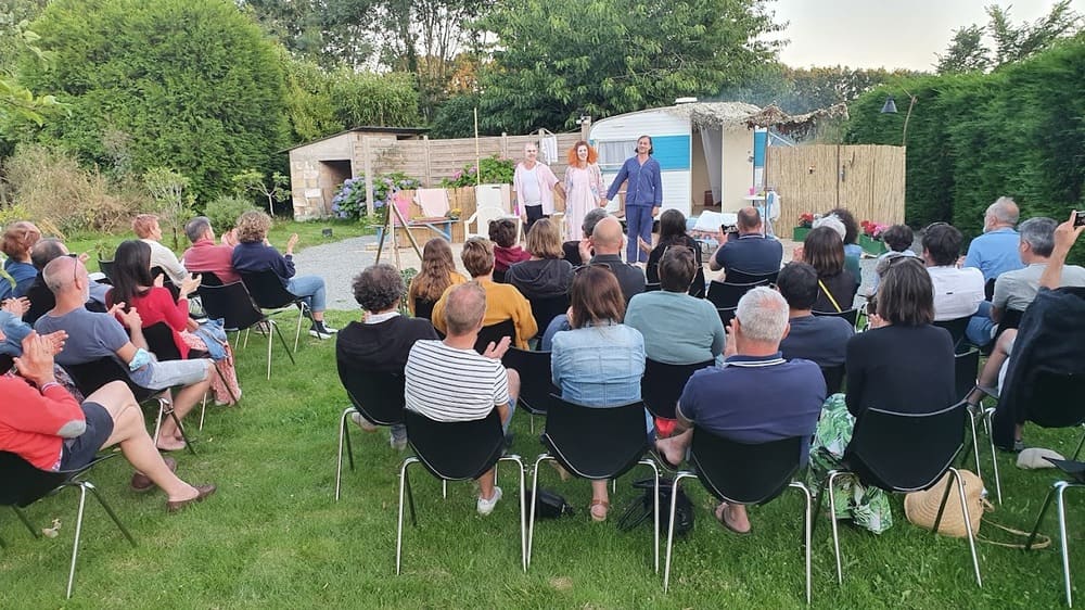 - Deux représentations de théâtre dans les jardins du 46 : la troupe parisienne Théâtre du Miroir a déployé son décor au milieu des pommiers ainsi que …. 46 chaises (avec l’adorable complicité de l’Archipel à Fouesnant). Pierre et moi avons accepté avec joie d’accueillir cette troupe en manque de représentation. Pour les raisons que vous connaissez, cette année fût difficile pour nombre de corporations, les comédiens ont souffert de ne pas pouvoir se produire dans des lieux publics. Aussi, l’alternative des jardins privés a permis qu’ils puissent jouer, à l’air LIBRE et au plateau ! Chapeau les artistes. La pièce ? Une laborieuse entreprise d’Hanock LEVIN. Une pépite