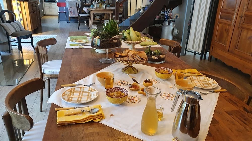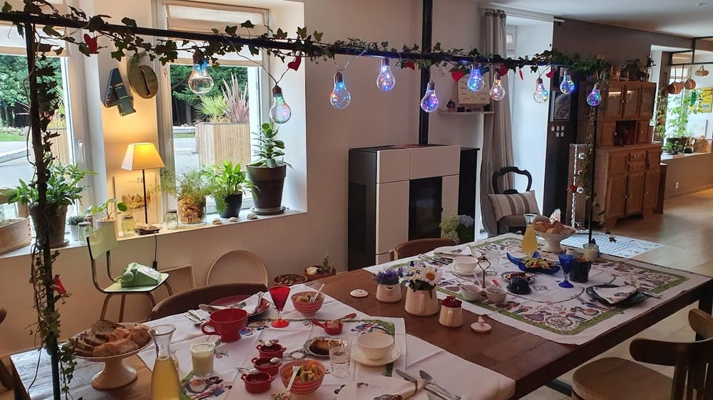 -Environ 300 décors différents de table de petits-déjeuner ! Oui, vous le savez à présent, c’est vous qui choisissez la couleur de votre vaisselle du matin. Je m’occupe du reste : nappage, serviettes, fleurs, verres… Souvenez-vous : je collectionne de la vaisselle depuis 25 ans, et je dispose d’imposants services aux multiples couleurs. Je chine en permanence. (lorsque je peux m’extraire du 46 !)